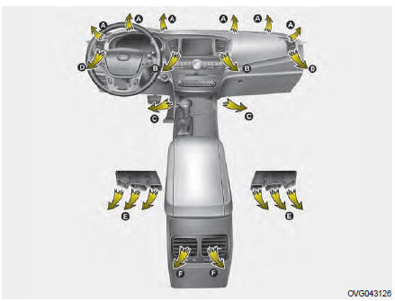 La majorité du courant d'air est dirigée vers le plancher et le parebrise, avec une petit courant d'air dirigé vers les dégivreurs latéraux.