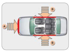 Dans ce cas, les détecteurs électroniques enregistrent et analysent les chocs frontaux et latéraux subis dans les zones de détection de choc (voir schéma) : en cas de choc violent , les airbags se déploient instantanément et protègent les occupants du véhicule (sauf le passager central arrière).