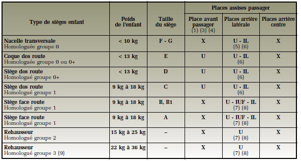 Pour connaître les places autorisées et les types de sièges enfants pouvant être installés à chacune des places assises autorisées, reportezvous aux tableaux en pages suivantes.