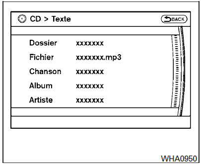 Ce texte et ces modes peuvent ne pas s'afficher lors de la lecture d'unCDnon codé. Sélectionnez la touche " Menu " au moyen du sélecteur NISSAN, puis la touche " Texte " pour afficher le texte associé au CD.