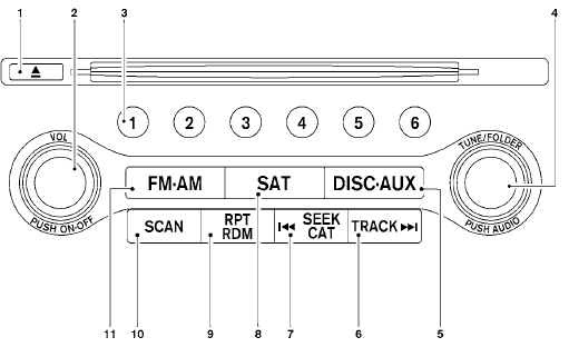 Bouton d'éjection de CD*Aucune réception radio par satellite n'est disponible lorsque vous appuyez sur le bouton SAT pour accéder aux stations de radio satellite si le récepteur et l'antenne satellite en option ne sont pas installés ou qu'aucun abonnement au service de radio satellite SiriusXM n'est en vigueur. La radio satellite n'est pas offerte en Alaska, à Hawaï et à Guam.