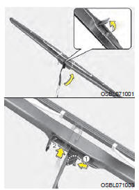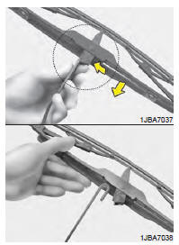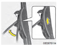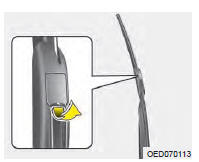 Kia Cadenza: Remplacement des lames d'essuie-glaceQuand les essuie-glace ne peuvent plus nettoyer le pare-brise efficacement, les lames sont probablement usées ou endommagées et il faut les remplacer.