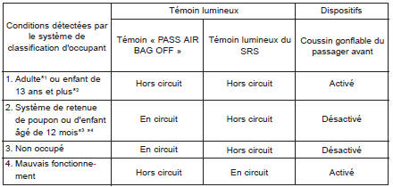 Le témoin du coussin de passager est situé sur la panneau central du tableau de bord. Le système détecte les conditions 1 à 4 au tableau suivant et met le coussin gonflable du passager avant en ou hors circuit d'après ces conditions.